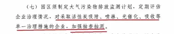 原文如下:“开展VOCs整治专项执法行动。严厉打击企业违法排污行为,对负有连带责任的环境服务第三方治理单位依法追责。2019年6月底前,各县(市)、区生态环境部门部门对采取单一活性炭吸附、喷淋、光催化、吸收等治理措施的企业进行抽查,依法查处违法排污行为,公布治理效果不达标、造假等第三方治理单位,依法限制或禁止其在市内开展相关业务。2019年底前,凡列入省VOCs重点监管企业名单的企业,均应自查VOCs排放情况、编制“一企一策”方案,各县(市)、区生态环境部门组织专家开展企业综合整治效果的核实评估、委托第三方抽取一定比例VOCs重点监管企业进行核查,确保治理见成效。”