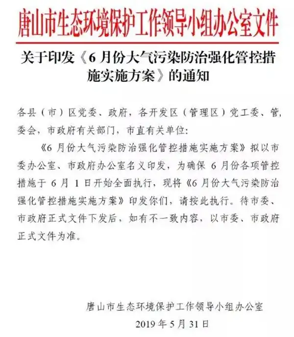5月31日,唐山市印发《6月份大气污染防治强化管控措施实施方案》:其中, 直接涉VOCs管控的规定有如下几点(如下两点内容朴华科技摘录2019年唐山市《6月份大气污染防治强化管控措施实施方案》):