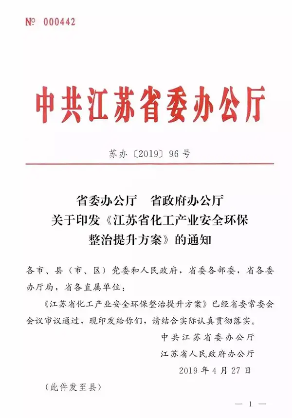 不仅仅南通,我们可看看整个江苏,2019年4月27日,江苏省委办公厅发布“江苏省化工产业安全环保整治提升方案”: