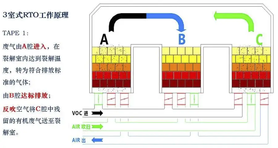 氧化产生的高温气体流经陶瓷蓄热体,使陶瓷体升温而“蓄热”,此“蓄热”用于预热后续进入的有机废气。从而节省废气升温的燃料消耗。陶瓷蓄热室应分成两个(含两个)以上,每个蓄热室依次经历蓄热-放热-清扫等程序,周而复始,连续工作。