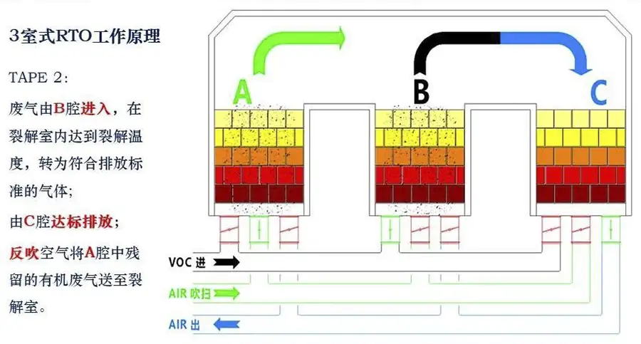 蓄热室“放热”后应立即引入适量洁净空气对该蓄热室进行清扫(以保证VOC去除率在98%以上),只有待清扫完成后才能进入“蓄热”程序。否则残留的VOCS随烟气排放到烟囱从而降低处理效率。