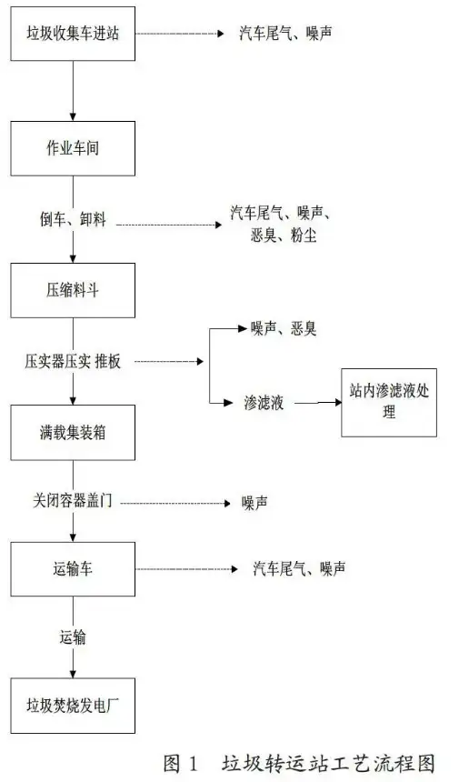 垃圾转运站可实现零散垃圾的收集,减小垃圾体积,有效降低运输成本,是治理城市生活垃圾污染环境的必不可少的设施。具体工艺见如下流程图见图1。