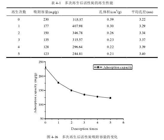 对同一活性炭进行反复多次的吸附、脱附,分析其再生后吸附容量、比表面积、孔体积、平均孔径。结果列于表4-1。