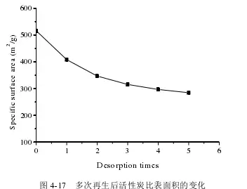由图4-17可以看出,随着再生次数的增加,活性炭再生后的比表面积逐渐减小且减小的幅度逐渐变缓。表明多次再生后活性炭的再生性能逐渐变差。