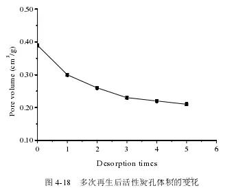 由图4-18可以看出,随着再生次数的增加,活性炭再生后的孔体积逐渐减小,且减小的幅度逐渐变缓。表明多次再生后活性炭的再生性能逐渐变差。