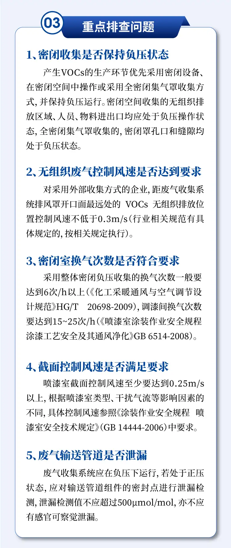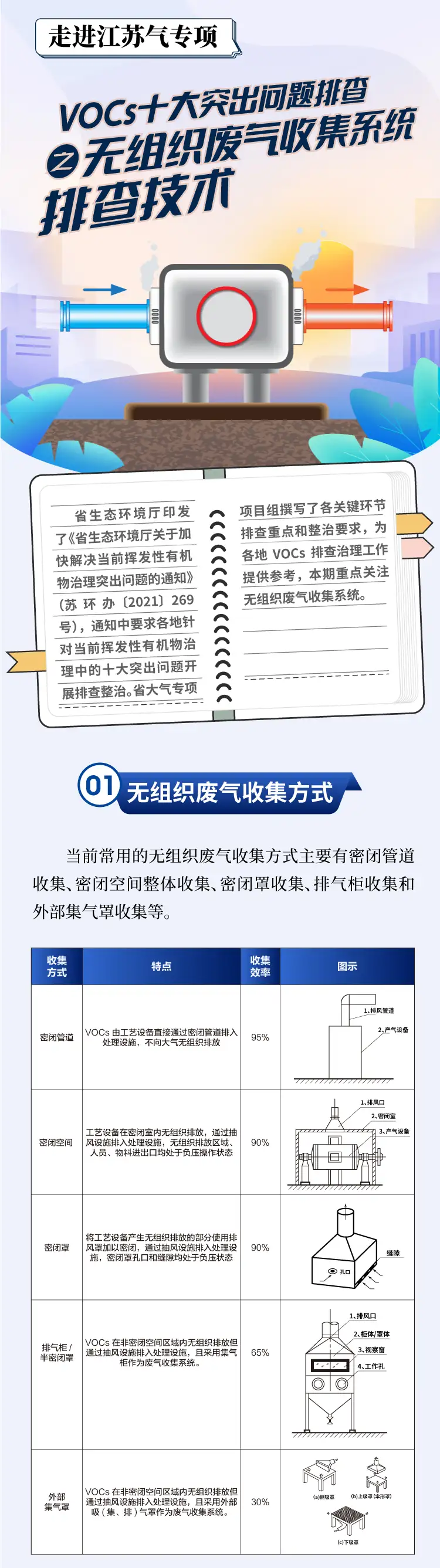 近日,江苏省生态环境厅印发了《省生态环境厅关于加快解决当前挥发性有机物治理突出问题的通知》(苏环办【2021】269号),通知中要求各地针对当前挥发性有机物治理中的十大突出问题开展排查整治。省大气专项项目组撰写了各关键环节排查重点和整治要求,为各地VOCs排查治理工作提供参考,本期重点关注无组织废气收集系统。