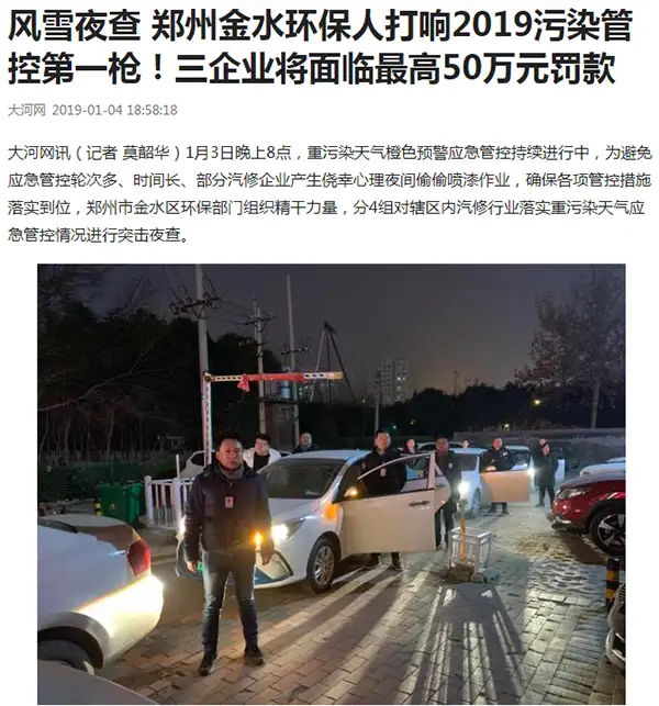 刚刚进入2019年,郑州市有机废气VOCs督查异常严格,为了应对极端重污染天气,郑州市金水区环保部门打响了汽修行业喷漆房有机废气污染防治第一枪。1月3日晚8点,郑州市金水区环保部门对辖区内汽修行业重点分布区开展突击检查。通过对39家汽修企业详细的检查,发现三家汽修企业在重污染天气橙色管控期间仍在喷漆作业,且没有对喷漆房有机废气采取任何的防治措施。依据《郑州市大气污染防治条例》第二十八条、第六十一条规定,监察人员依法对其立案调查,三家违规喷漆企业将面临5万到50万元的行政处罚罚款。