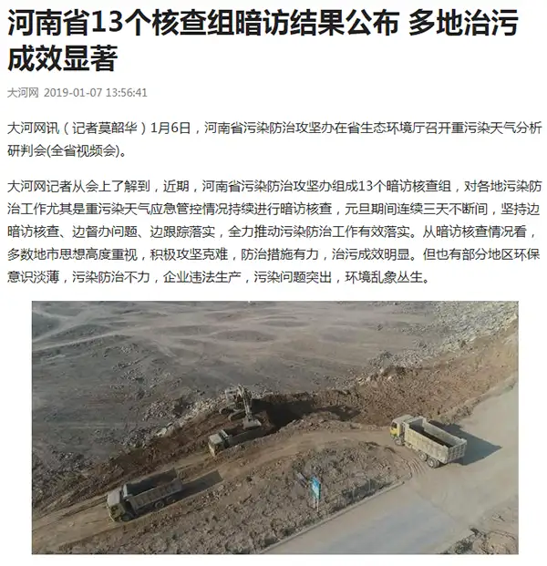 1月6日,河南省生态环境厅召开了全省重污染天气分析研判视频会议,对于1月2日《河南商报》报道的《这些企业违法排污,被省生态环境厅长“抓现行”》给予了高度重视,报道反映平顶山、汝州市、禹州市、洛阳偃师市环境污染问题突出,针对上述市县的相关部门和属地政府履职不力、企业违法排污等情况,省相关厅局委已经公开介入交办,进入调查处理程序。