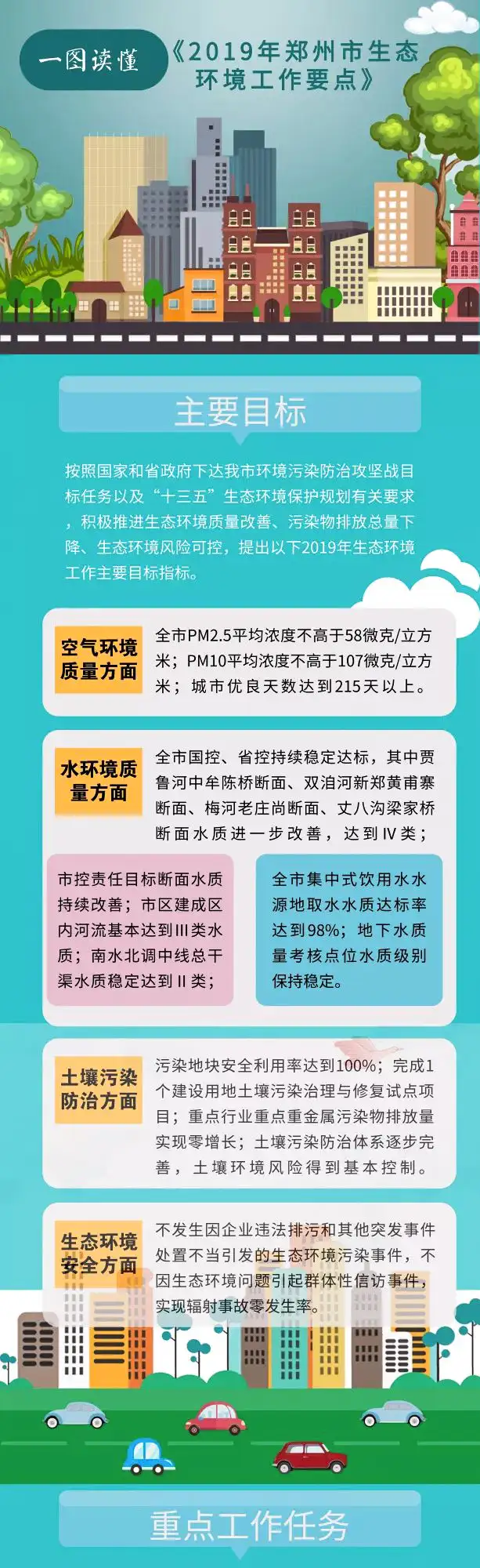 2019年空气质量目标为全市PM2.5平均浓度不高于58微克/立方米,PM10平均浓度不高于107微克/立方米,城市优良天数达到215天以上。热心的小伙伴,2019年生态环境重点工作内容,朴华科技已经为您提炼好了,一图读懂!