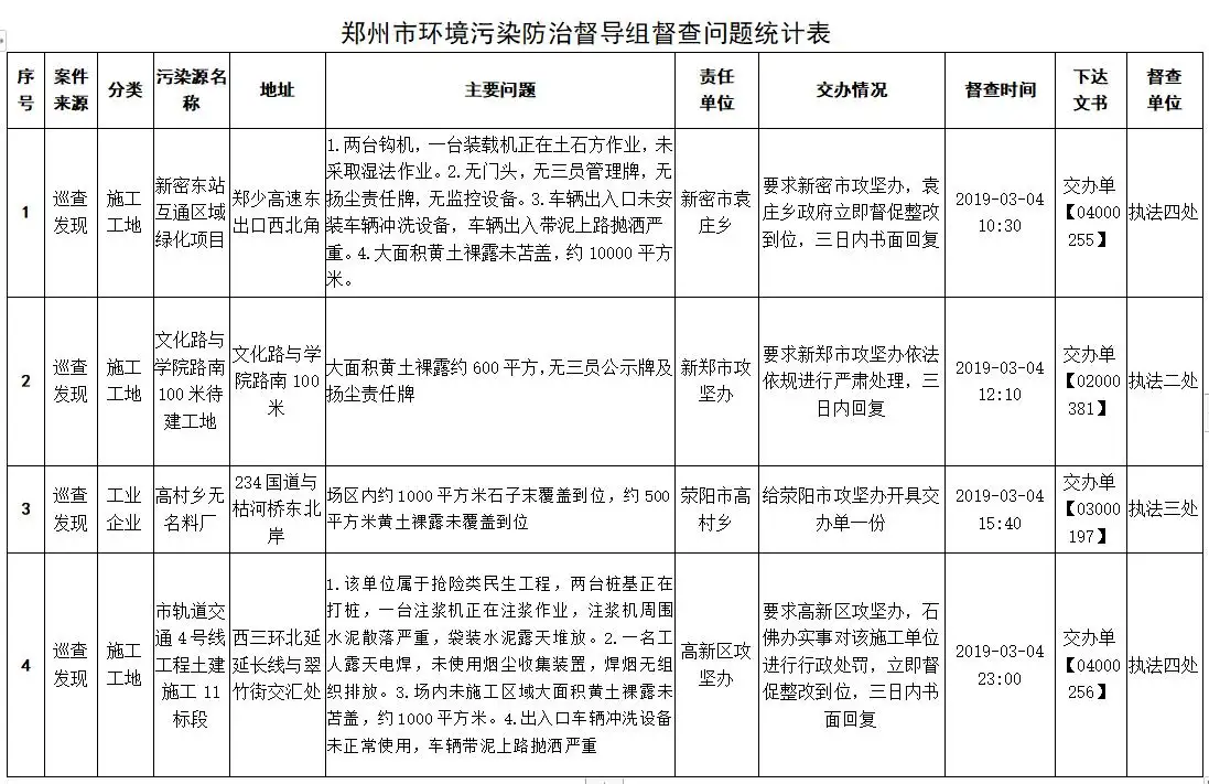 3月4日08时至3月5日08时,市环境污染防治督导组共出动7个督查组28人次,督查施工工地25家、工业企业6家,现场查处16项问题(惠济区3起、荥阳市3起、中原区2起、二七区2起、新密市2起、新郑市2起、金水区1起、高新区1起),其中施工工地12家、工业企业4起,开具交办单4份。
