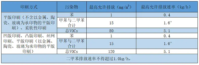 印刷污染物指标应达到《大气污染物综合排放标准》(GB16297-1996)、《恶臭污染物排放标准》(GB14554-1993)的二级排放要求。